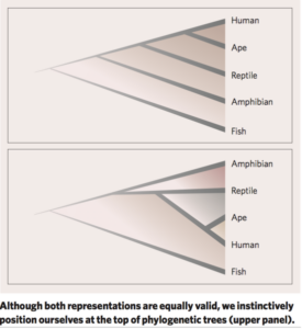 Scrive il biologo evoluzionista Sean Nee: «La persistenza nel porre noi stessi al culmine della Grande catena dell’Essere suggerisce che abbiamo un profondo bisogno psicologico di vedere noi stessi al culmine della creazione» (Nee, 2005, 429). Nee propone il presente schema: